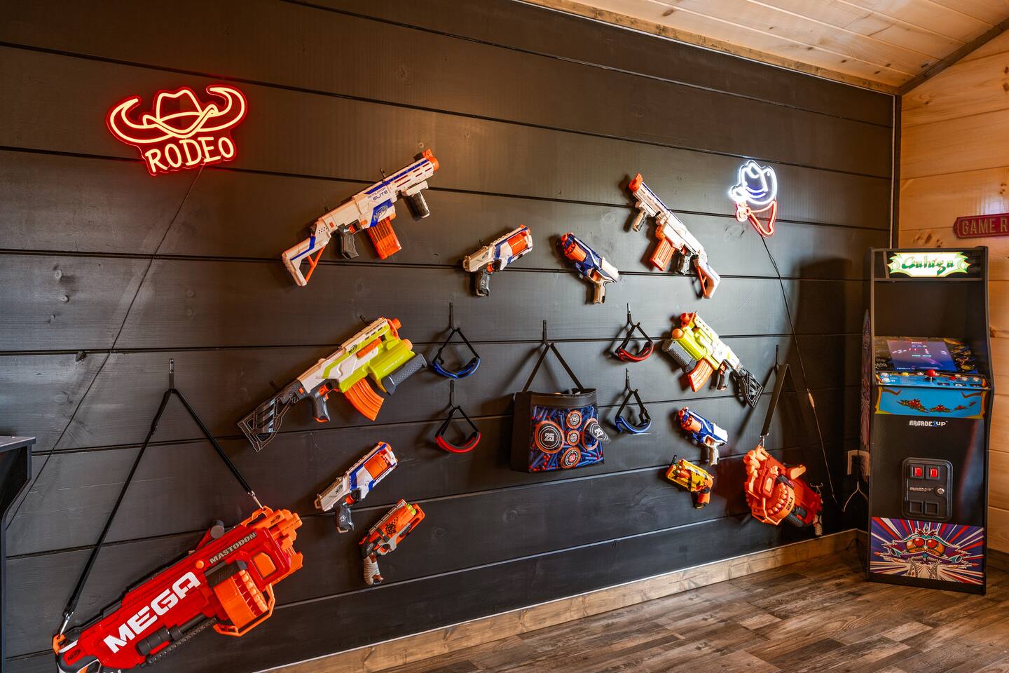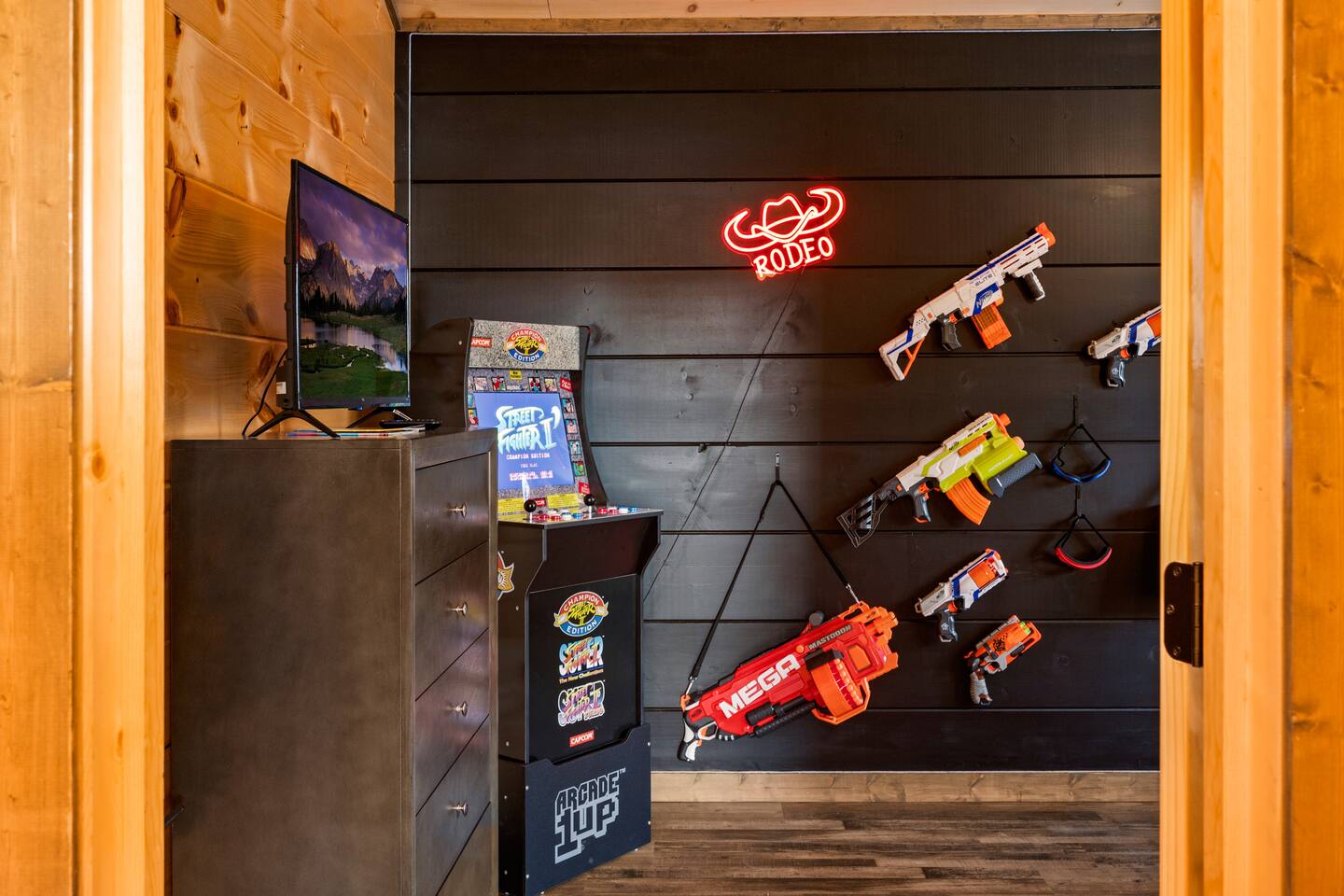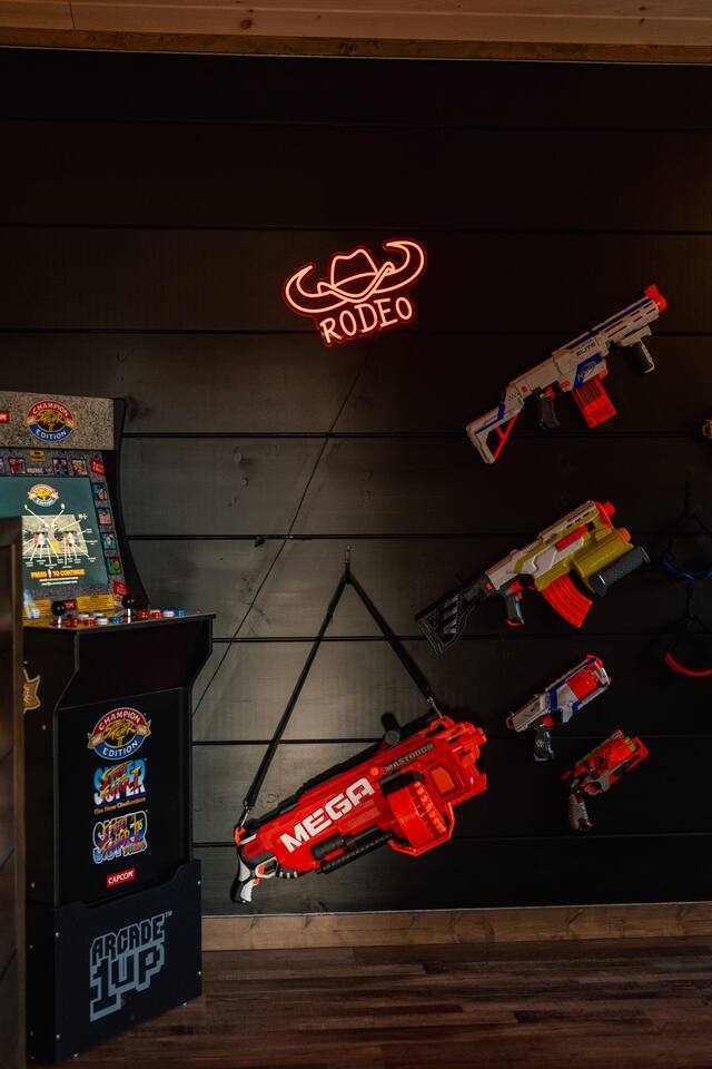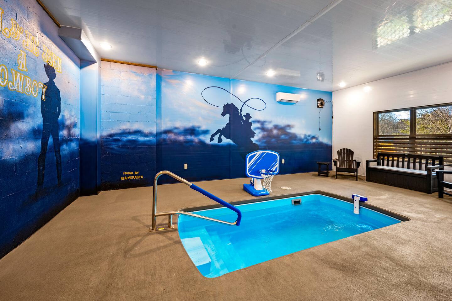 9 Mins Drive to Soaky Mountain Waterpark 9 Mins Drive to Convention Center 10 Mins Drive to Wilderness 20 Mins Drive to Buc-ee’s 25 Mins Drive to Dollywood 32 Mins Drive to Anakeesta 37 Mins Drive to Parkway With Dollywood, The Island, and Soaky Mountain Waterpark only minutes away, you’ll never be short on fun activities to take part in. Whether it's the fully-equipped kitchen, the electric fireplace, the game area, the indoor pool, and the TVs in each bedroom, we promise you'll find something to love about "Cowboy Slingers" Cabin ✷ Outdoor hot tub ✷ Indoor pool with an insta-worthy wall ✷ 4 bedrooms: 2 king-size beds and 1 queen-size bed ✷ 2 full bathrooms, 2 half bathrooms ✷ 3 full decks for entertainment ✷ Modern and cozy living room with electric fireplace ✷ Open concept and spacious kitchen ✷ Smart TV in each bedroom ✷ Multiple arcade machines and board games ✷ Flat driveway with 3 parking spaces INDOOR POOL + HOT TUB Get ready to make a splash in our indoor pool! Located on the lower level, the pool is a favorite among kids and adults alike, with a depth of 4ft at the deep end. Relax in the comfortable lounge chairs while keeping an eye on the little ones as they swim and play. After your swim, step out onto the spacious outdoor deck and soak in the beautiful natural surroundings from the hot tub. With plenty of space to unwind and breathe in the fresh mountain air, you'll feel rejuvenated and refreshed. Come experience the ultimate in relaxation and fun at our mountain retreat, complete with an indoor pool and outdoor hot tub. LIVING ROOM & KITCHEN After a long day of exploring outside, settle down on one of the comfy couches facing the electric fireplace in the living room, and turn on the TV to find a movie for the whole family. The fully-equipped kitchen comes prepared with all the basics and amenities you could think of, including a Keurig 12-cup drip coffee maker and everything you may need to cook a full meal. Make the most out of your stay and head to the community pool to cool off, relax, and refresh. The community pool is open daily from 8 AM to 8 PM (open Memorial Day through Labor Day). You will need pool ID tags, which are required to let you access the pool. PARKING Never worry about parking! There's free parking space for up to 3 cars directly in front of the cabin. Please note that the ladybug season in the Smokies is from Oct to Dec! We have a monthly pest control service, and you may see dead ladybugs inside as a result of the treatment, and this is very common in the mountains. We appreciate your understanding, and a vacuum is available for your use as needed. DISTANCE FROM MAJOR LOCATIONS 9 Mins Drive to Soaky Mountain Waterpark 9 Mins to Convention Center 10 Mins to Publix Supermarket 11 Mins to Starbucks 14 Mins to Waffle House 15 Mins to Popeye’s 20 Mins to Buc-ee’s 22 Mins to The Island 25 Mins Drive to Dollywood 26 Mins drive to The Island in Pigeon Forge 32 Mins Drive to Anakeesta 37 Mins Drive to Parkway 40 Mins Drive to Gatlinburg Please note that the ladybug season in the Smokies is from Oct to Dec! We have a monthly pest control service, and you may see dead ladybugs inside as a result of the treatment, and this is very common in the mountains. Please also note that due to being in the wilderness, you may encounter a bug, small critters, or even a bear. We appreciate your understanding, and a vacuum is available for your use as needed.