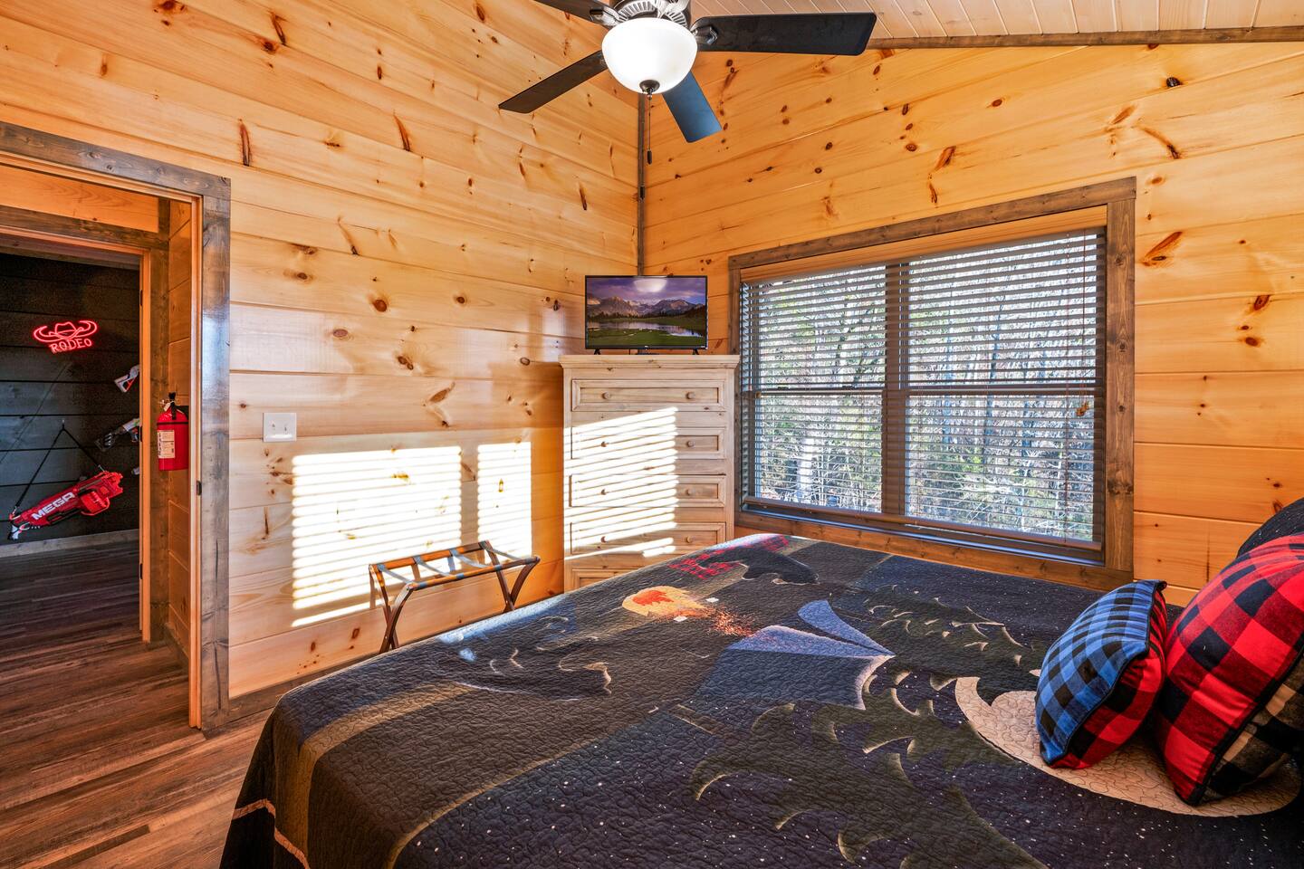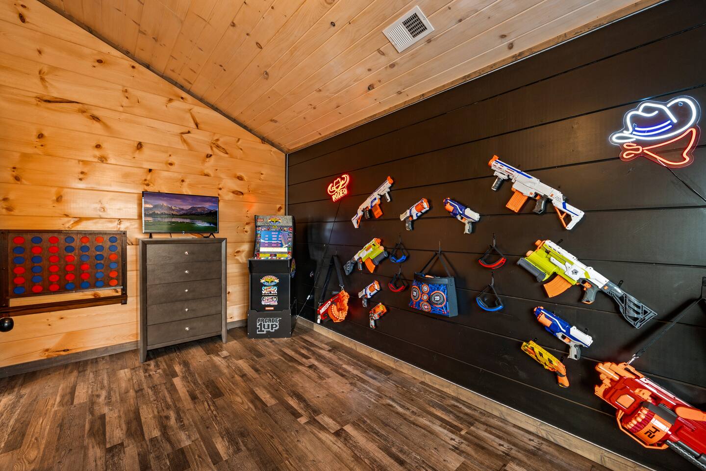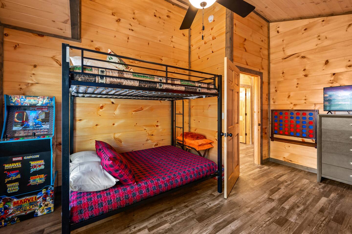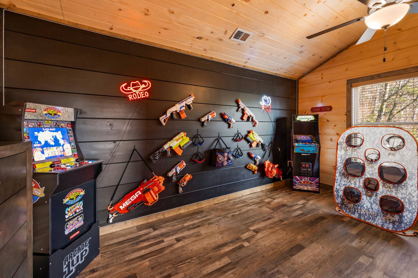 9 Mins Drive to Soaky Mountain Waterpark 9 Mins Drive to Convention Center 10 Mins Drive to Wilderness 20 Mins Drive to Buc-ee’s 25 Mins Drive to Dollywood 32 Mins Drive to Anakeesta 37 Mins Drive to Parkway With Dollywood, The Island, and Soaky Mountain Waterpark only minutes away, you’ll never be short on fun activities to take part in. Whether it's the fully-equipped kitchen, the electric fireplace, the game area, the indoor pool, and the TVs in each bedroom, we promise you'll find something to love about "Cowboy Slingers" Cabin ✷ Outdoor hot tub ✷ Indoor pool with an insta-worthy wall ✷ 4 bedrooms: 2 king-size beds and 1 queen-size bed ✷ 2 full bathrooms, 2 half bathrooms ✷ 3 full decks for entertainment ✷ Modern and cozy living room with electric fireplace ✷ Open concept and spacious kitchen ✷ Smart TV in each bedroom ✷ Multiple arcade machines and board games ✷ Flat driveway with 3 parking spaces INDOOR POOL + HOT TUB Get ready to make a splash in our indoor pool! Located on the lower level, the pool is a favorite among kids and adults alike, with a depth of 4ft at the deep end. Relax in the comfortable lounge chairs while keeping an eye on the little ones as they swim and play. After your swim, step out onto the spacious outdoor deck and soak in the beautiful natural surroundings from the hot tub. With plenty of space to unwind and breathe in the fresh mountain air, you'll feel rejuvenated and refreshed. Come experience the ultimate in relaxation and fun at our mountain retreat, complete with an indoor pool and outdoor hot tub. LIVING ROOM & KITCHEN After a long day of exploring outside, settle down on one of the comfy couches facing the electric fireplace in the living room, and turn on the TV to find a movie for the whole family. The fully-equipped kitchen comes prepared with all the basics and amenities you could think of, including a Keurig 12-cup drip coffee maker and everything you may need to cook a full meal. Make the most out of your stay and head to the community pool to cool off, relax, and refresh. The community pool is open daily from 8 AM to 8 PM (open Memorial Day through Labor Day). You will need pool ID tags, which are required to let you access the pool. PARKING Never worry about parking! There's free parking space for up to 3 cars directly in front of the cabin. Please note that the ladybug season in the Smokies is from Oct to Dec! We have a monthly pest control service, and you may see dead ladybugs inside as a result of the treatment, and this is very common in the mountains. We appreciate your understanding, and a vacuum is available for your use as needed. DISTANCE FROM MAJOR LOCATIONS 9 Mins Drive to Soaky Mountain Waterpark 9 Mins to Convention Center 10 Mins to Publix Supermarket 11 Mins to Starbucks 14 Mins to Waffle House 15 Mins to Popeye’s 20 Mins to Buc-ee’s 22 Mins to The Island 25 Mins Drive to Dollywood 26 Mins drive to The Island in Pigeon Forge 32 Mins Drive to Anakeesta 37 Mins Drive to Parkway 40 Mins Drive to Gatlinburg Please note that the ladybug season in the Smokies is from Oct to Dec! We have a monthly pest control service, and you may see dead ladybugs inside as a result of the treatment, and this is very common in the mountains. Please also note that due to being in the wilderness, you may encounter a bug, small critters, or even a bear. We appreciate your understanding, and a vacuum is available for your use as needed.